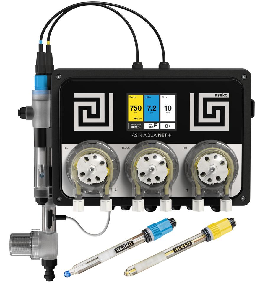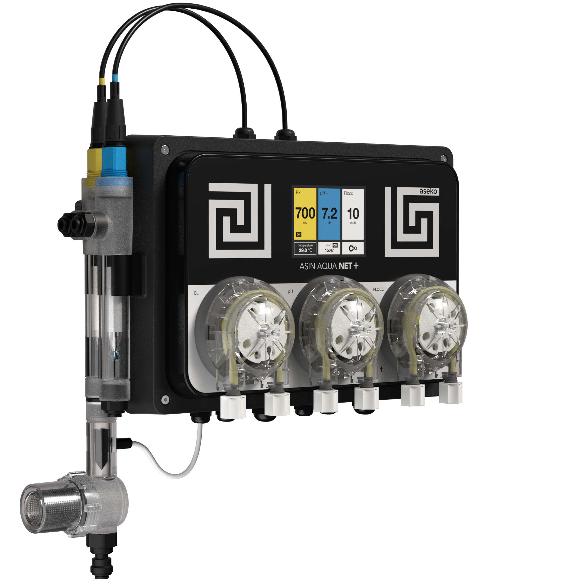 Umožňuje meranie a dávkovanie dezinfekcie a pH. Je vybavený elektronickým prietokomerom a LAN konektorom pre pripojenie k INTERNETU a tiež teplotným snímačom pre meranie tepoty bazénovej vody. K ASIN Aqua NET je možné pripojiť externý dotykový displej.