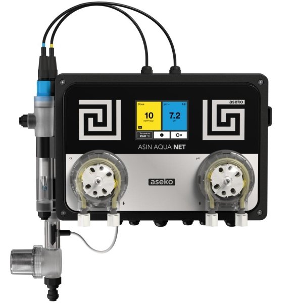 Je vybavený elektronickým prietokomerom a LAN konektorom pre pripojenie k INTERNETU. K ASIN Aqua NET Dose je možné pripojiť externý dotykový displej. Časové dávkovanie bezchlorovej dezinfekcie SANOSIL.