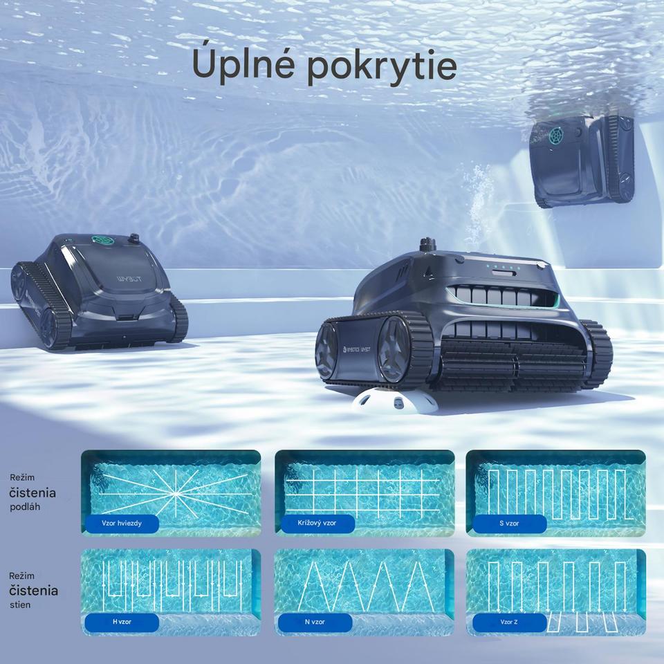 Na jedno nabitie je schopný vysávať až 210 minút. Vybrať si môžete zo štyroch čistiacich cyklov a čistenie bazéna tak naplánovať na celý týždeň.