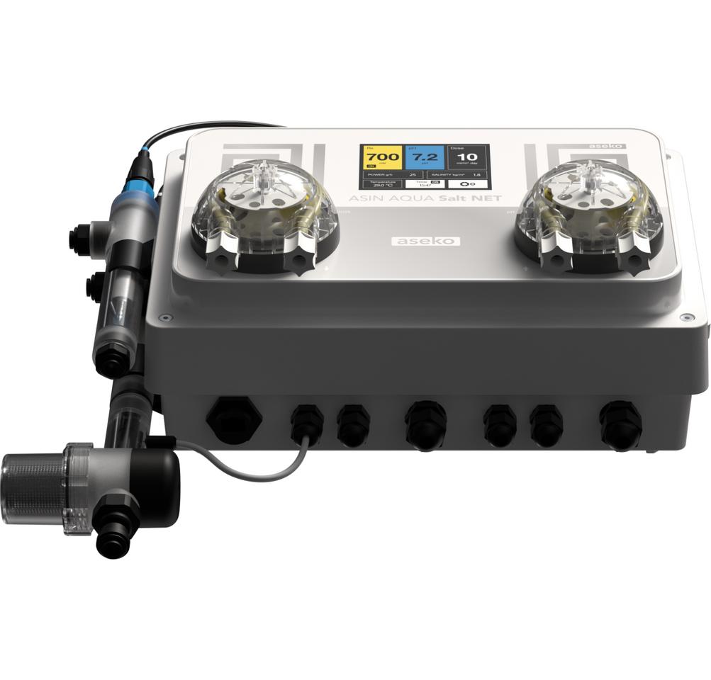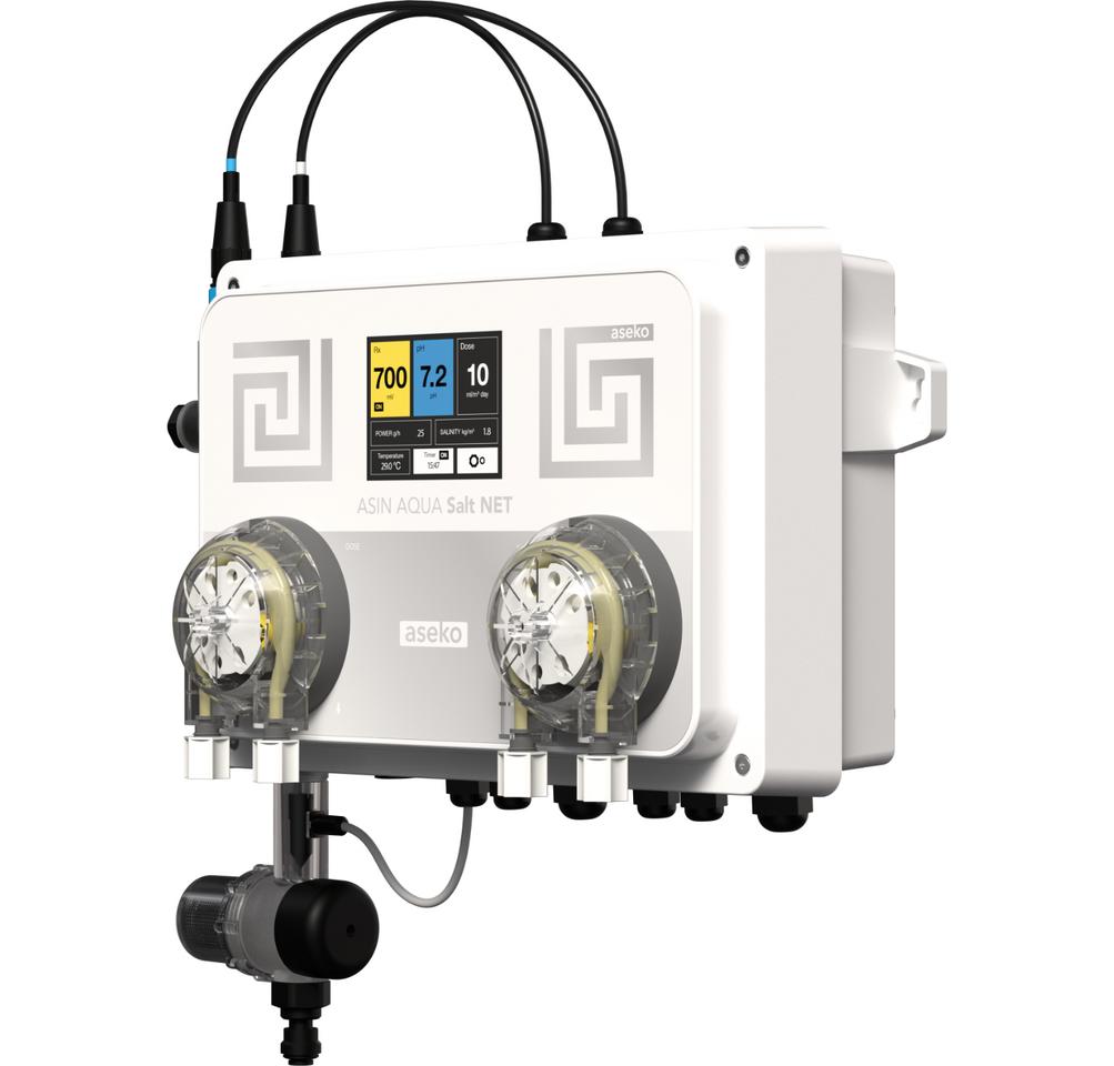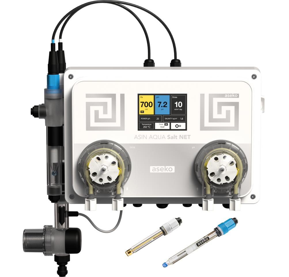 ASIN AQUA Net Redox Salt je kompaktný automatický systém na úpravu bazénovej vody, špeciálne vyvinutý pre riadenie bazénov so slanou vodou. Prístroj automaticky meria a upravuje pH a na základe aktuálnej potreby (merania Redox potenciálu) zapína alebo vypína váš soľinátor. Vďaka pripojeniu na internet umožňuje kompletný vzdialený dohľad bazéna cez mobilnú aplikáciu alebo webové rozhranie.