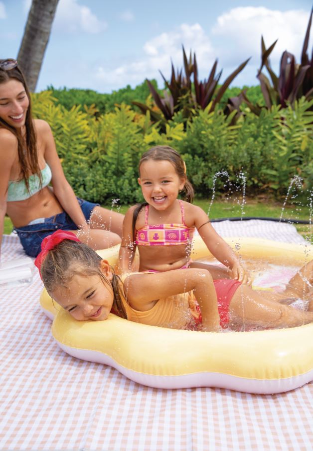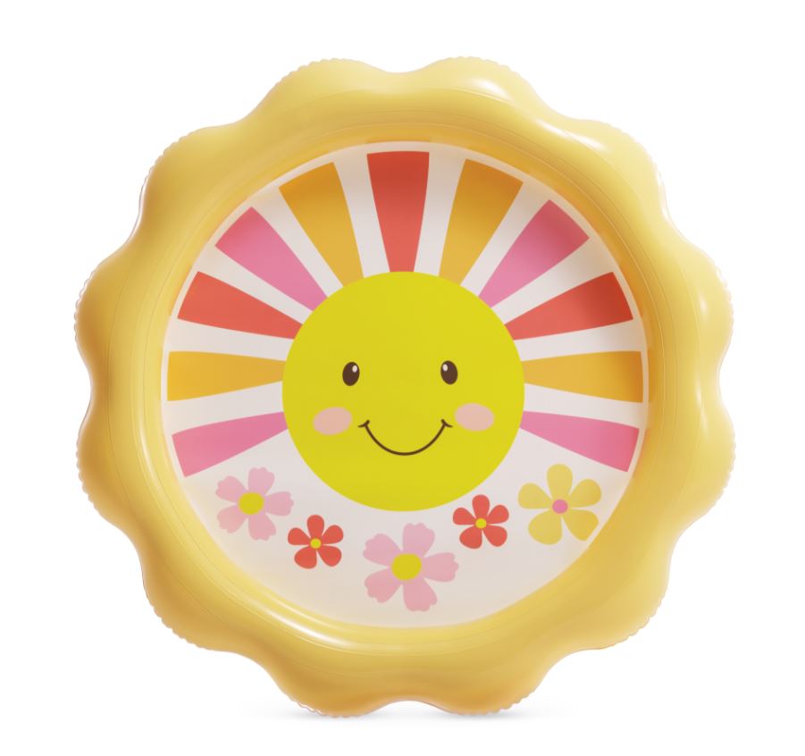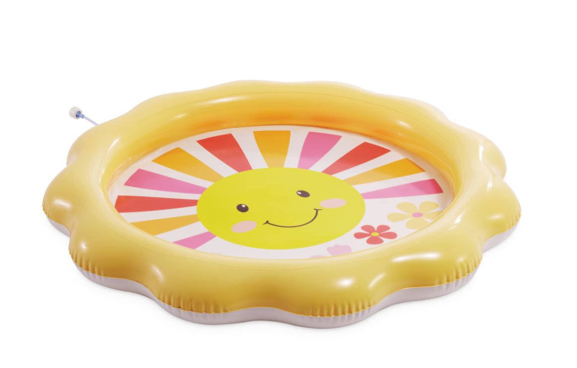 Nafukovací detský bazén v tvare slniečka. Po pripojení k záhradnej hadici vznikne vďaka otvorom po obvode príjemná spŕška.