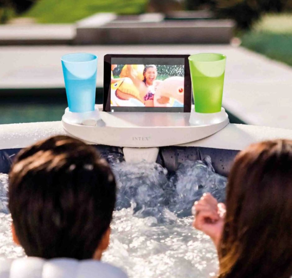 Prémiový držiak nápojov a tabletu vám ešte viac spríjemní relaxáciu vo vírivke. Umiestnite držiak so skladacími klapkami na okraj akejkoľvek PureSpa vírivky a začnite relaxovať! S dvojitým držiakom nápojov si môžete vychutnať svoj obľúbený nápoj, vďaka stojanu na smartfón alebo tablet môžete sledovať film či počúvať hudbu priamo z vody. Zapnite relaxačné biele LED svetlá a vytvorte dokonalú atmosféru. Batérie sú súčasťou balenia.
