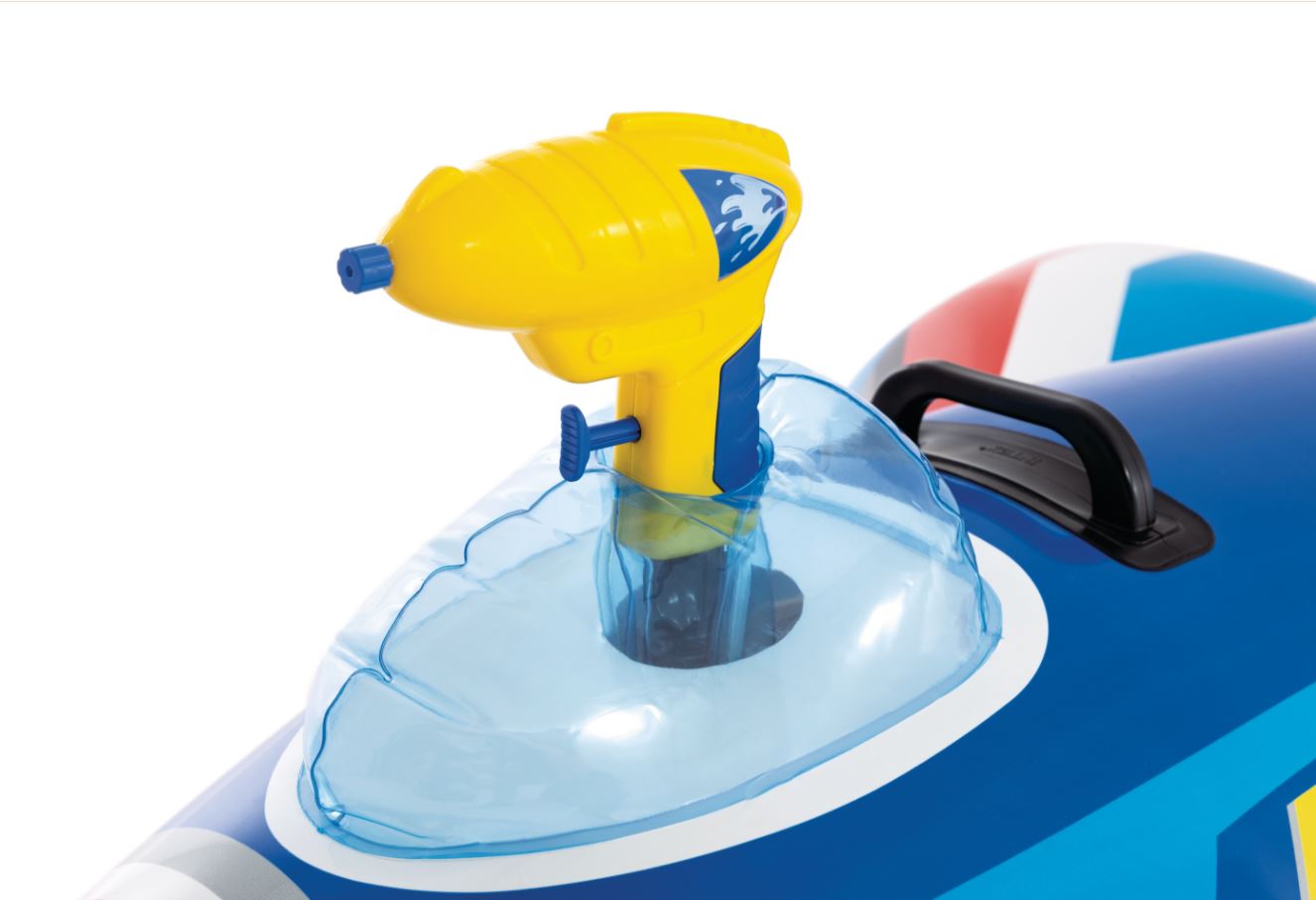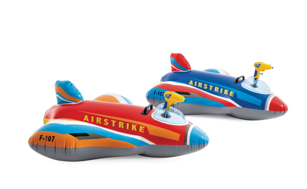 Nafukovacia stíhačka so zabudovanou vodnou pištoľou a jedným odolným držiakom je originálna detská hračka do vody. Vyrobená je z kvalitného, testovaného vinylu spĺňajúceho najprísnejšie bezpečnostné normy na spracovanie a použité materiály.