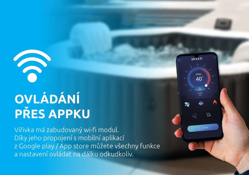 Ovládanie WiFi aplikácie Intex ® Spa Management Vám umožňuje pomocou mobilného zariadenia zapnutie/vypnutie funkcií vírivky, a dokonca aj diaľkového programovania času pre neskoršie použitie.