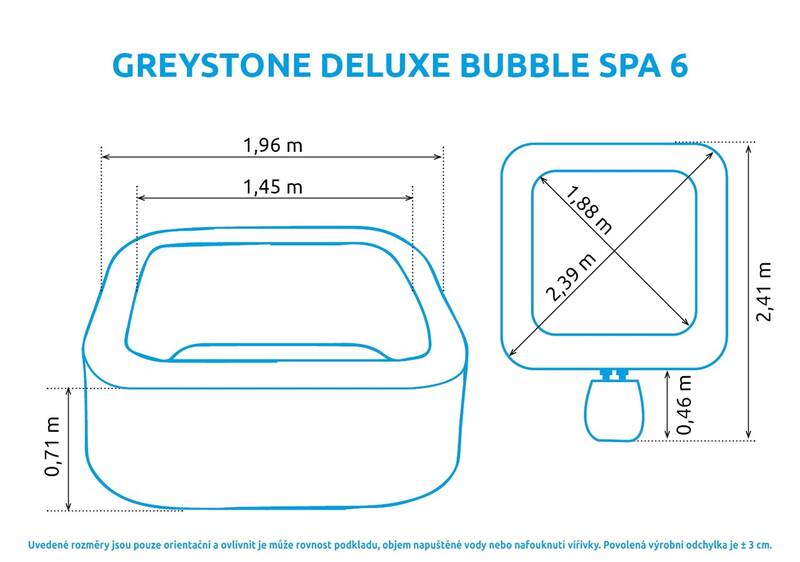 S vonkajšou veľkosťou 239 × 239 (merané uhlopriečne) x 71 cm Vám vírivka Pure Spa GREYSTONE DELUXE neponúka iba miesto na relaxáciu pre 6 osôb, ale aj nepreberné množstvo zábavy a pohodlia.